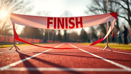 disengaged. Vibrant red and white finish line ribbon stretched taut across a marathon track. event key visuals, club posters, designed for fitness apps and gym onboarding, used by sports marketers.