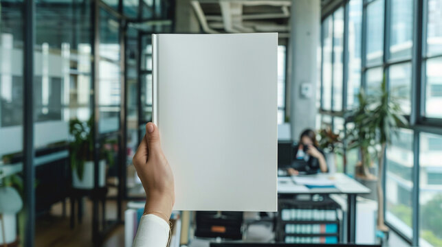 Person Holding Blank White Book. Ideal for showcasing custom cover designs or as a placeholder in creative projects. Neutral backdrop for design focus.