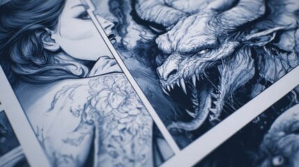 Close-up view of monochromatic graphic novel pages.