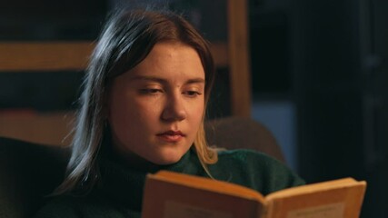 Smiling beautiful woman sitting on the floor in the library holding a book. Dog pun on orange chair reading a novel with her. Long horizontal banner. Happy relaxed weekend at home with tails