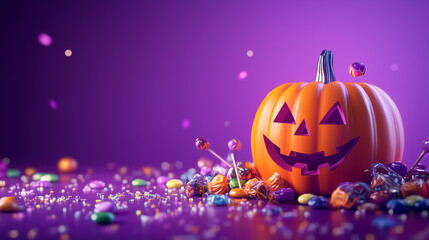 Colorful Halloween Decoration with a Pumpkin and Novelty Candy Toys, Set Against a Purple Background for a Vibrant and Cheerful October Party