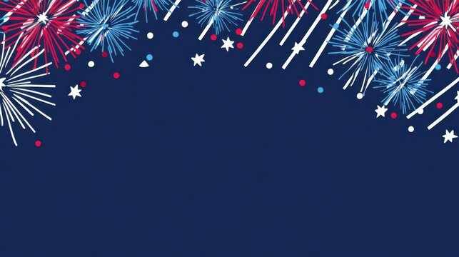 Happy 4th of July banner design showing dark blue background with colorful fireworks