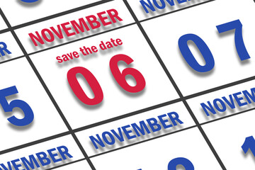 november 6th. Day 6 of month, Date marked Save the Date  on a calendar. autumn month, day of the year concept