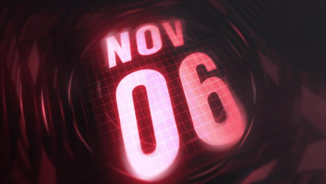 6 November in 3d motion graphic. Infrared calendar in futuristic and tech glowing neon for takes, commemoratives in led and etc. 4k in loop