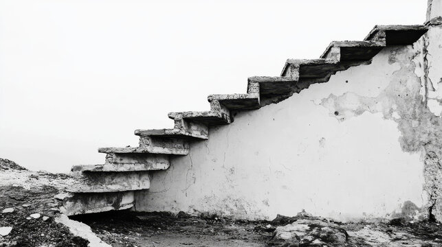 Abstract black and white stairs lead nowhere on a distressed wall. The worn concrete steps evoke feelings of decay and abandonment.