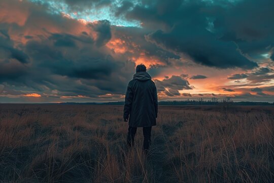 Lonely lost man stands in the field in the middle of nowhere at sunset, rear view