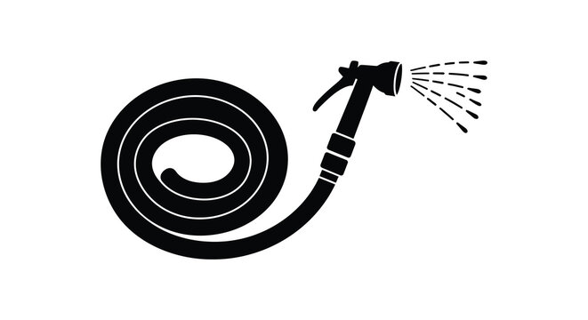 Black silhouette of a coiled garden hose with a spray nozzle emitting water droplets on a white background
