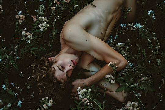 Jeune homme nu allongé dans les fleurs