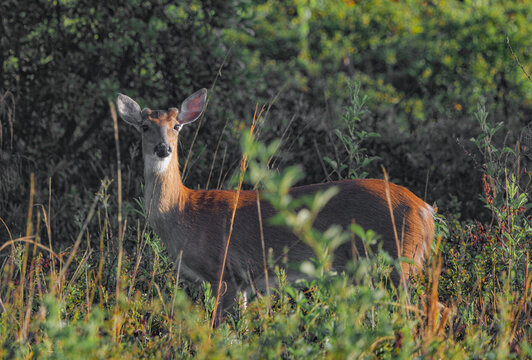 Young male white tailed deer bucks - Odocoileus virginianus clavium - standing at edge of tree line