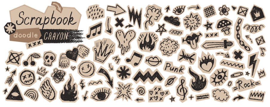 Rock scrapbook. Punk music doodle cutout collage sticker. Punk rock music icon pattern. Torn paper with scribble tattoo. Shape nub bg. Fire, heart, star, skull. Bold journal hand drawn scrap element