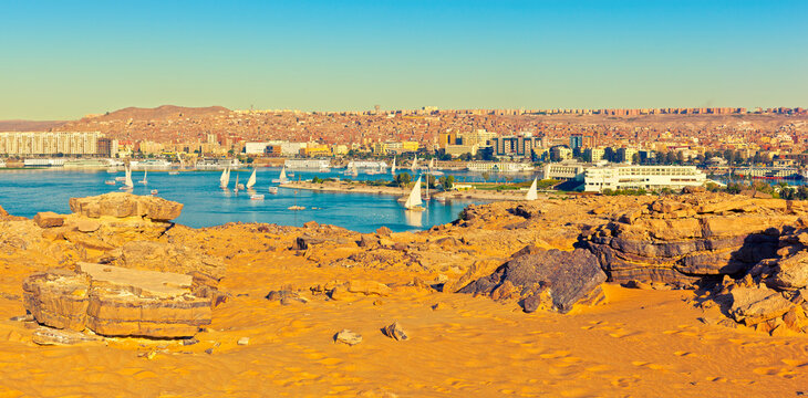View of Aswan from the West bank of the Nile River. Egypt