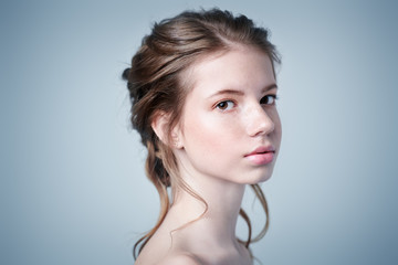 Beautiful blonde nude woman sitting on white background. Black & white film. Film grain. Copy space for text.