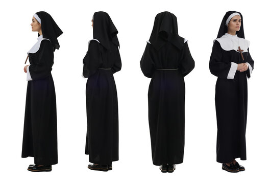 Collage with photos of young nun on white background