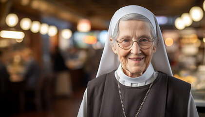 smile elderly nun in traditional clothes, Happy senior nun portrait smiling.catholic