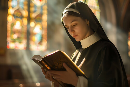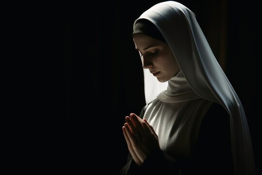 Serene caucasian nun in black habit deep in prayer inside the church, a devout portrait