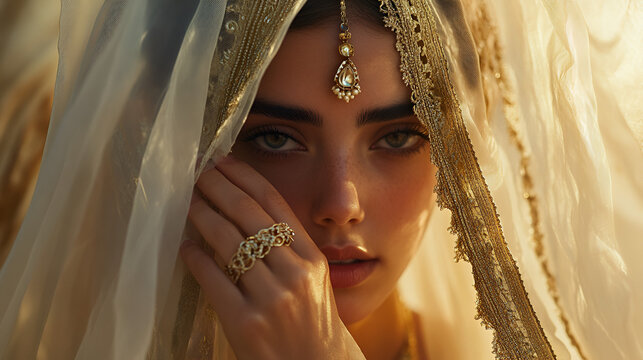 Couple in ornate, traditional Indian wedding clothing