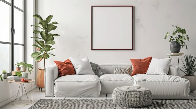 A mock-up poster frame is situated within a hipster room, against a Scandinavian-style interior background, illustrated in 3D.