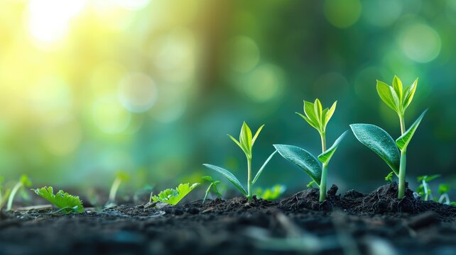 Seedlings in soil with bright sunlight