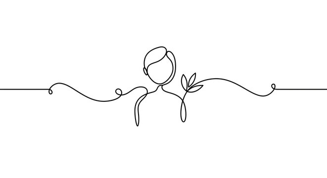 A minimalist continuous line drawing of a person holding a small plant with leaves.