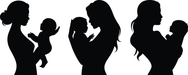 Mother and baby silhouette, nurturing pose, maternal care vector, black illustration, family bonding, motherhood icon, parent child clipart, love and affection