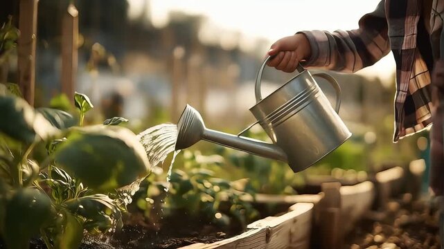 Girl watering plants with a watering can in the garden, cheerful expression, outdoor activity