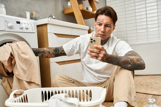 Relaxing moments in a cozy home while doing laundry and enjoying a smartphone