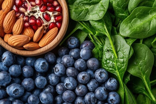Discover vitality through a balanced diet with our Healthy dietary nutrition concept A collection of nutrient-rich foods including fish, blueberries, nuts, pomegranate, spinach, and flax seeds, top