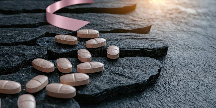 An artistic depiction of pink pills scattered on a textured surface, accompanied by a soft pink ribbon, symbolizing health and awareness.