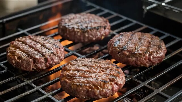 Juicy burgers sizzling on a fiery grill, perfect for summer cookouts and grilling season promotions