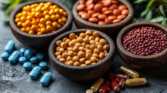 A view of a kitchen counter with a variety of vitamins and supplements, representing a commitment to nutritional supplementation.