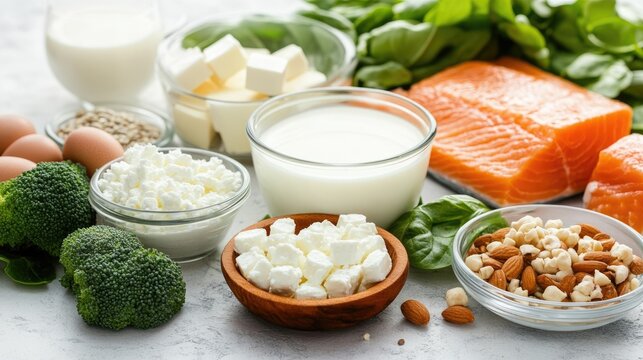 Assortment of calcium-rich foods including salmon fillets, eggs, nuts, seeds, spinach, beans, and a small pitcher of oil on a blue textured surface, highlighting healthy nutrition