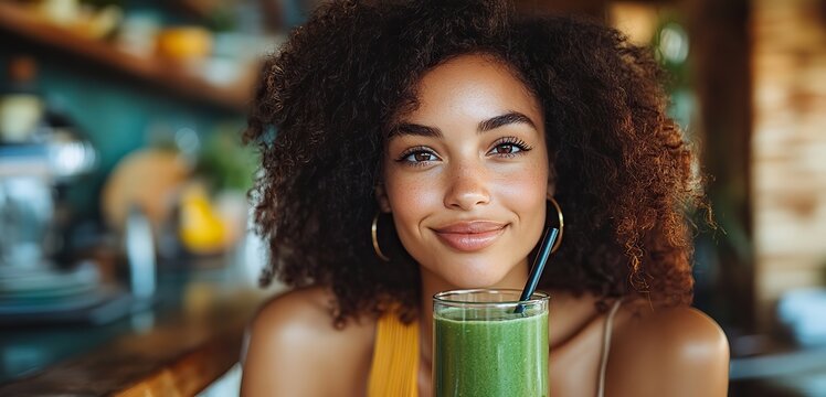 A woman enjoys sipping a healthy green smoothie in her kitchen, embracing a nutritious lifestyle.