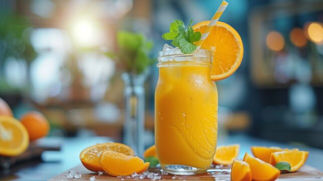 Fresh berry smoothie in glass jars with straw and mint leaves on table
