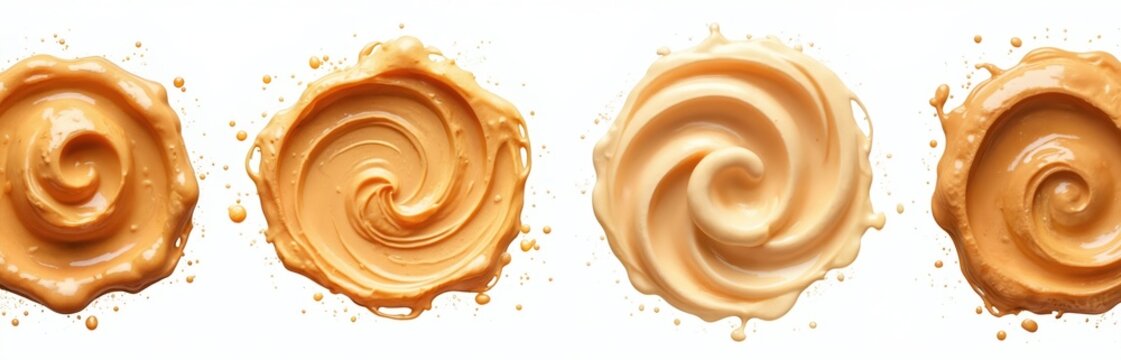Four swirls of creamy peanut butter spread on white background. Creamy, smooth nutty spread with textured splashes. Nutritious food element for breakfast or snacks.