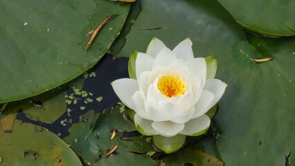 Closeup of a single Nymphaea candida water lily flower on green lily pads