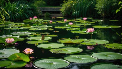 White lotus flowers blooming in a lake with lily pads, as a nature background