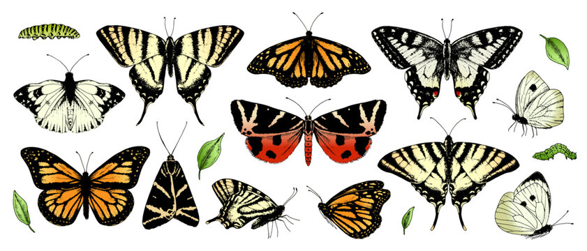 Large set of colored vector butterflies. Realistic hand drawn illustrations ideal for nature themed designs or spring events. Perfect for stickers or wedding decor