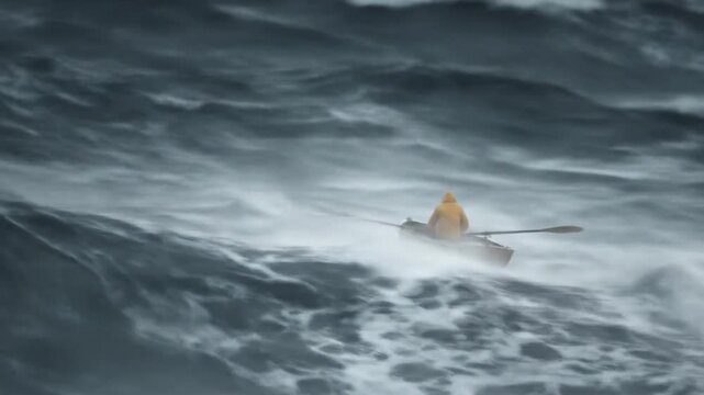 A Stormy Sea and A Lonely Boat: A solitary rowboat battles relentless waves, enveloped by a tempestuous sky, portraying a scene of struggle and solitude.