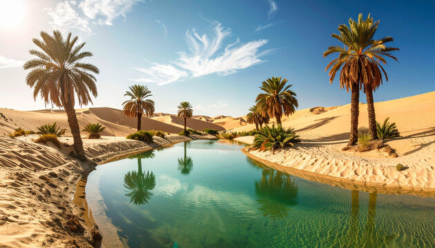 the image shows a serene oasis nestled within a vast desert landscape.  clear, turquoise water forms a calm pool, reflecting the blue sky and scattered clouds above