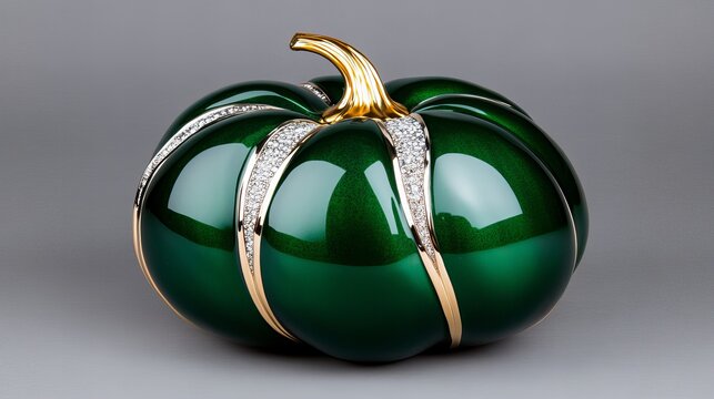 A luxurious green pumpkin-shaped objet d'art, adorned with gold accents and sparkling diamonds.  A statement piece.