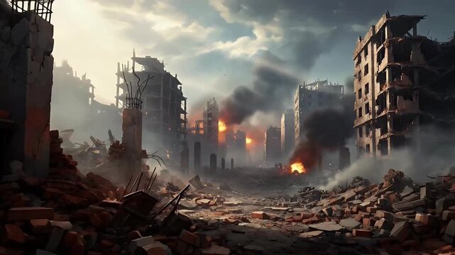A desolate and grim cityscape lies in ruins under a moody, overcast sky, showcasing the devastating aftermath of a major catastrophe or conflict. Collapsed buildings, shattered structures, and piles o