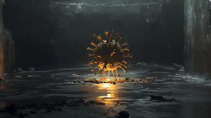 Degradation and oblivion during covid pandemic, pictured as declining phrase oblivion and a corona virus to symbolize current problems caused by epidemic, 3d illustration. Oblivion. Illustration