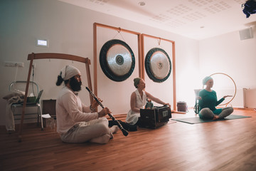 Woman sitting in lotus pose near musicians playing on ethnic instruments near gongs in room