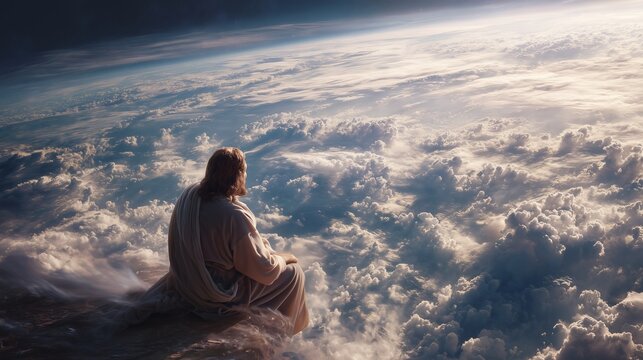 Jesus creates the world while observing the skies and clouds from above during a divine moment of creation