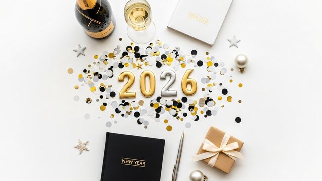 Bold black 2026 graphic with confetti elements celebrating the future year