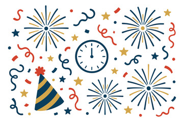 Celebration icons: cake, candle, balloon, party hat, fireworks, award ribbon