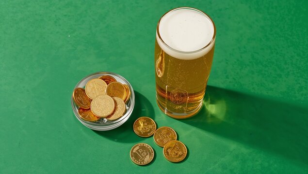 Beer Glass and Shamrock on Green Surface for Celebration Around St Patricks Day