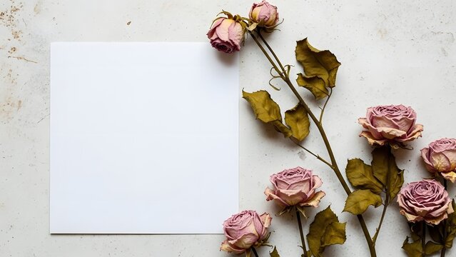 A bouquet of pink roses and a blank white card on a textured surface for wedding or romantic occasion stationery and invitations