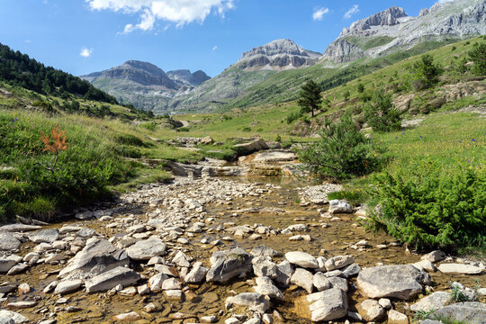 Aisa valley mountains at sunset in the occidental pyrenees valleys in the north of Spain. Huesca, Aragón, Spain.