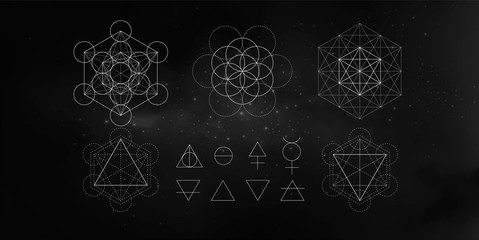 Design set with graphic drawings of mystic and religions and devil symbols. Freemasonry and secret societies emblems, occult and spiritual mystic drawings. Tattoo design, new world order.